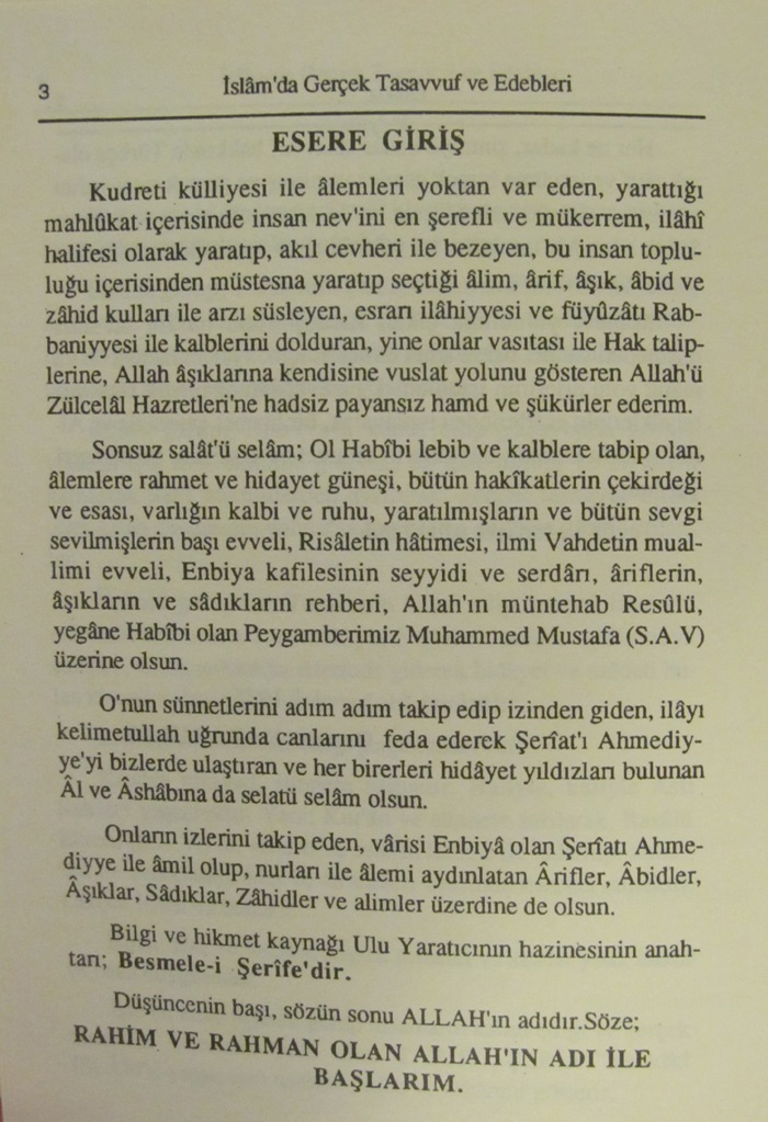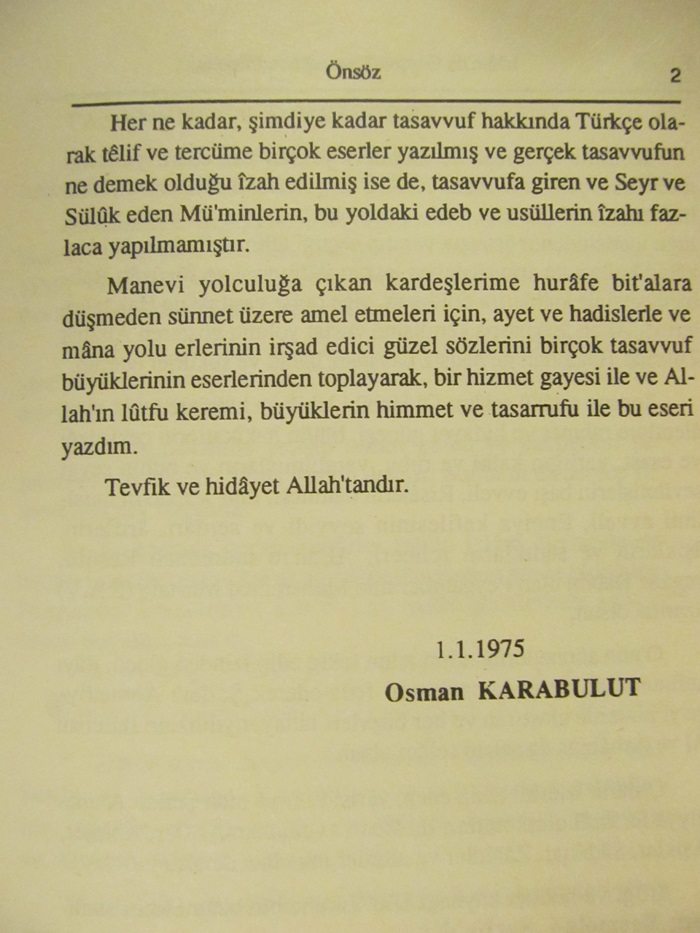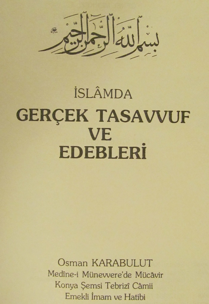 Uzun yıllardır baskısı yapılmamış olduğu için temin edilemeyen ve bastırabilmemiz için Vakfımıza maddî ve manevî yetki vermiş olan merhûm ve mağfûr Osman KARABULUT Hocaefendinin, gerçek tasavvuf erlerinin yolu olan TARÎK’ı ŞERÎAT’ı (hakîkî İSLÂM’ı) yaşamanın usulûnü, edeb ve erkânını gösteren “İSLÂM’DA GERÇEK TASAVVUF ve EDEBLERİ” isimli eseri Vakfımızca bastırılarak sizlerin istifadesine arz edilmiştir.